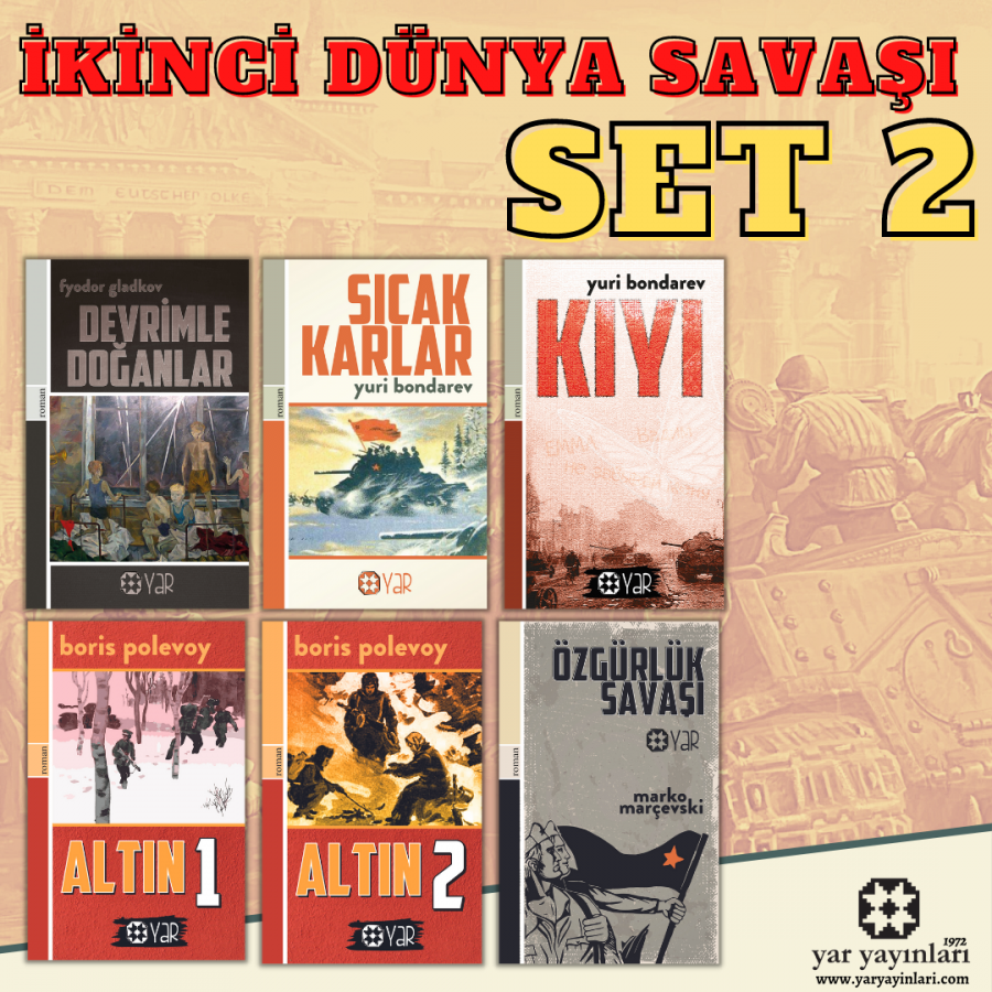 Yayınevimiz tarafından yayınlanan kitaplar arasından, İkinci dünya savaşı yıllarında çeşitli cephelerde, ülkelerde geçen roman, öykü, belgesel vb türlerden oluşturulmuştur. Toplam fiyatı avantajlı olacak şekilde okurlarımızın beğenisine sunulmaktadır.